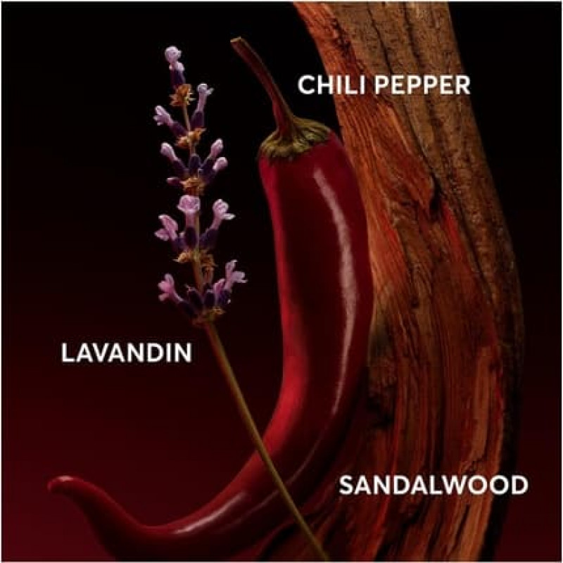 The scent opens with a thrilling burst of heat that transitions into aromatic herbaceous energy, then settles into a luxurious woody foundation. The dominant chili note gives it a unique edge—warm yet refined.